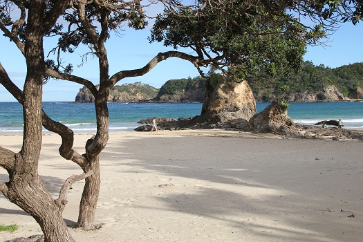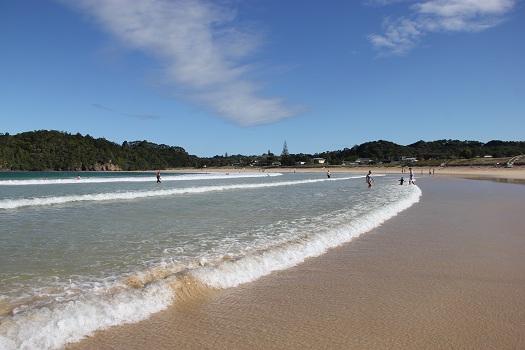 Nummer 2: Tawharanui, nördliches Auckland. Eigentlich geht es um drei nebeneinander gelegene Buchten, mit Anchor Bay in der Mitte. Pros: Hübscher weißer Sand, nach einem schweren Sturm 2012 allerdings nicht mehr in überbordenden Massen, gute Erreichbarkeit und mit Klos, usw. ausgestattet. Angeln oder Sammeln von Muscheln und Schnecken sind nicht gestattet, da Seeschutzgebiet. Dafür ist Tawharanui aber ein ausgewiesener Surfspot. Eine ganz große Attraktion ist, dass Tawharanui im Moment renaturiert wird, es sind sogar wieder Kiwis angesiedelt worden! Cons: Kann etwas überlaufen sein, bei rauhen Wellen nicht ungefährlich, beim Schnorcheln erstaunlich wenig Fischspezies zu sichten (aber sehr viele Stachelrochen).