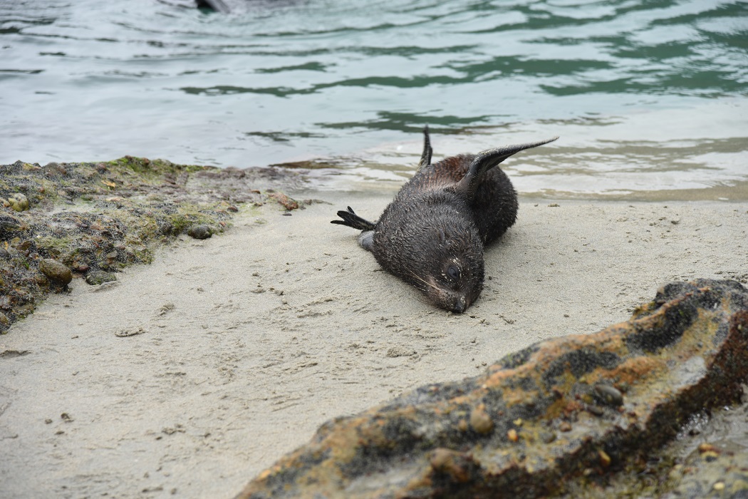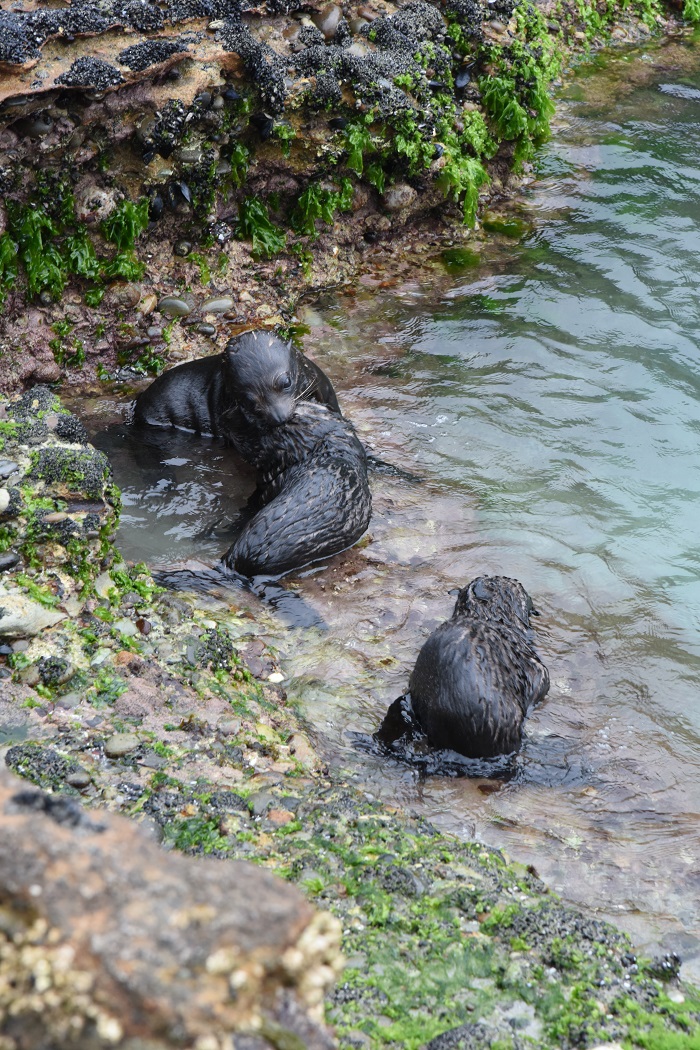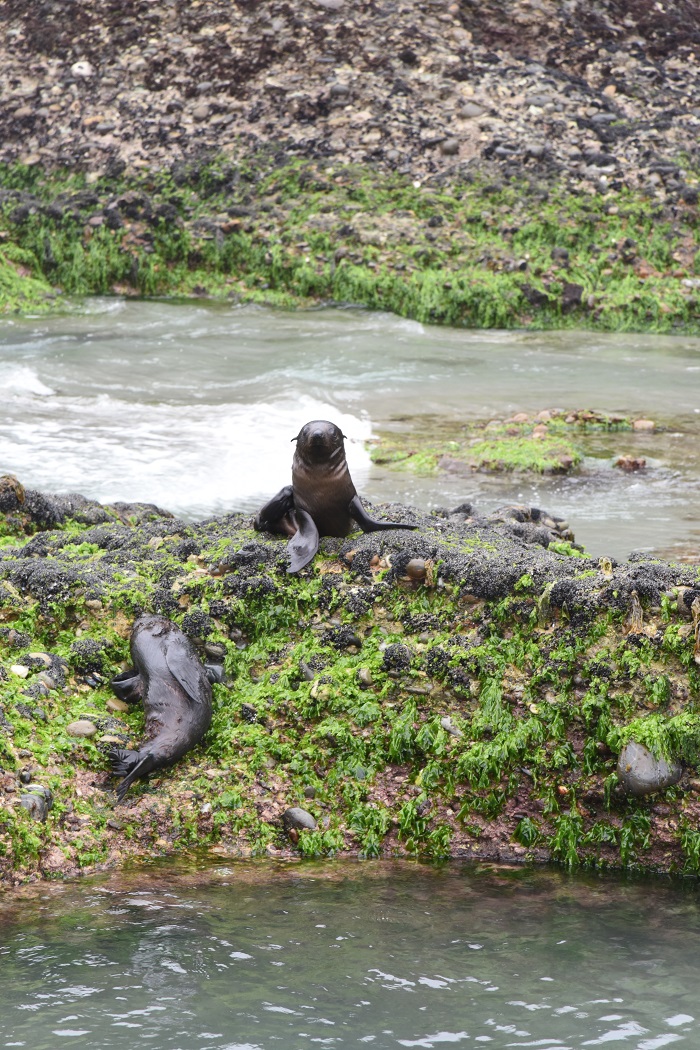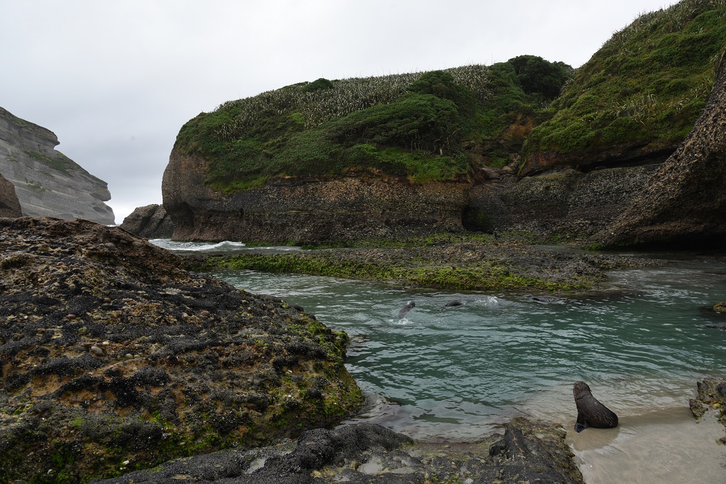 Mit etwas Glück haben die Robben („New Zealand fur seals„) gerade Junge gehabt (zwischen Januar und September findet man sie mit der größten Wahrscheinlichkeit), die sich um die vorgelagerten kleinen Inseln tummeln. Bei Ebbe sind die „Archway Islands“ vom Strand zu Fuß aus zu erreichen und wenn die Sonne nicht zu sehr herunterknallt und die Mütter gerade auf Fischfang sind, verwandeln sich die natürlichen Pools um die Inselchen in veritable Robbenkindergärten.