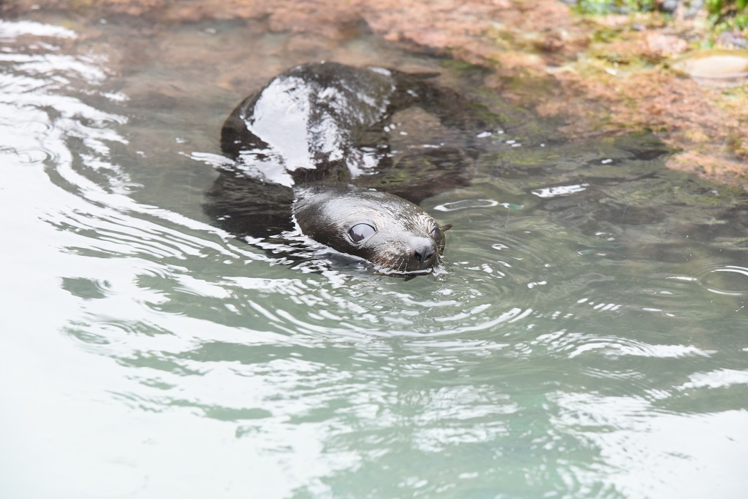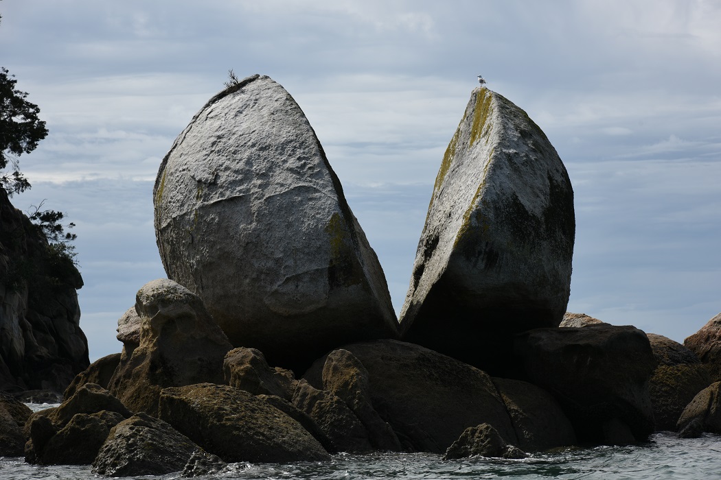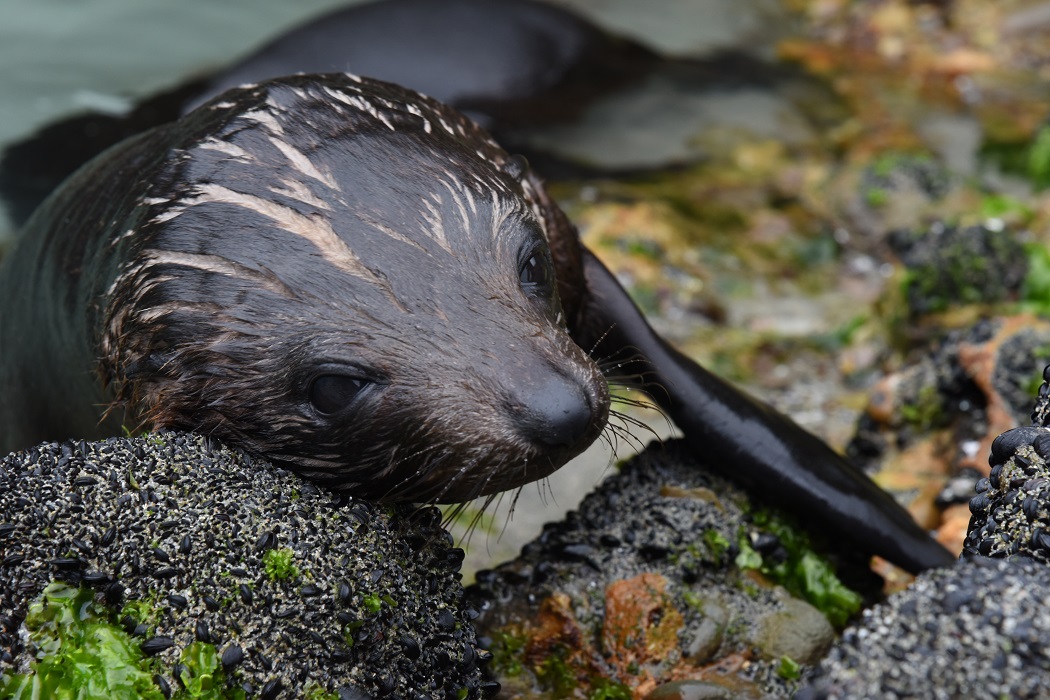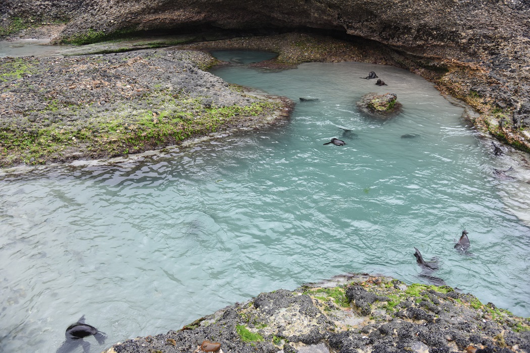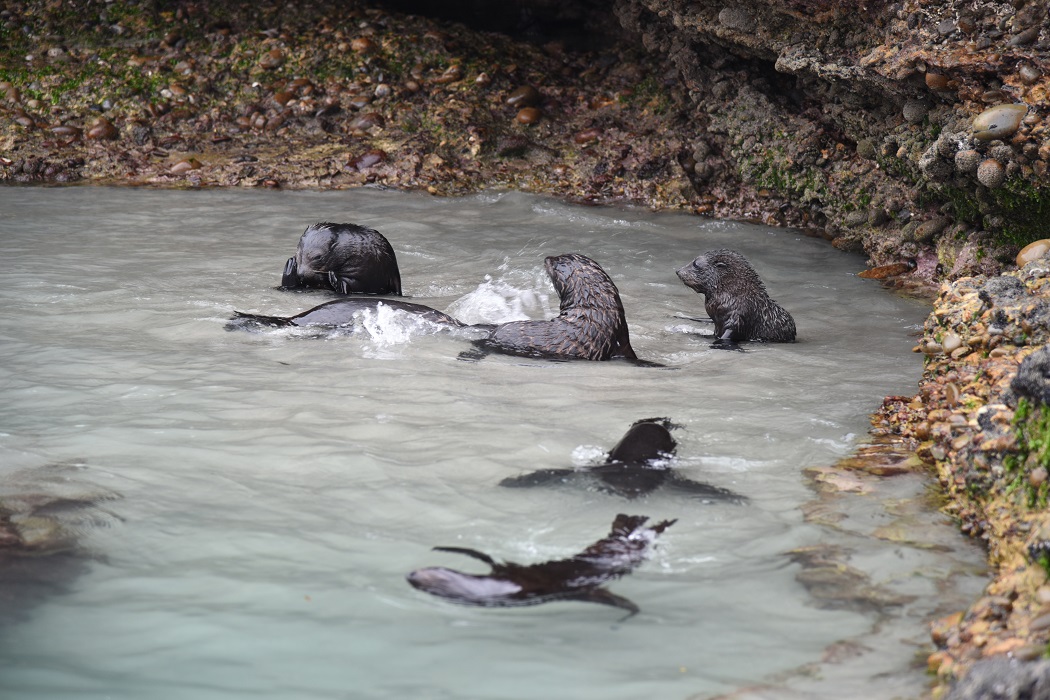 Mit etwas Glück haben die Robben („New Zealand fur seals„) gerade Junge gehabt (zwischen Januar und September findet man sie mit der größten Wahrscheinlichkeit), die sich um die vorgelagerten kleinen Inseln tummeln. Bei Ebbe sind die „Archway Islands“ vom Strand zu Fuß aus zu erreichen und wenn die Sonne nicht zu sehr herunterknallt und die Mütter gerade auf Fischfang sind, verwandeln sich die natürlichen Pools um die Inselchen in veritable Robbenkindergärten.