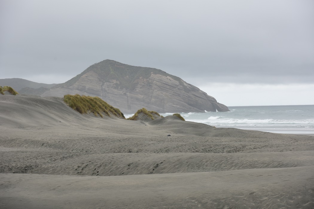 Die letzten paar Kilometer der Strecke zum Parkplatz (neben einer Art Backpacker Cafe, bei -40.509113, 172.684968) geht es über eine ungeteerte Straße, die aber problemlos befahrbar ist. Wharariki Beach mit seinen gradiosen Sanddünen ist dann nur noch einen etwa 30-minütigen Spaziergang entfernt, der von Schafweiden gesäumt ist, aber auch durch Reste herrlichen Buschlands führt (und ohne Wespen, wie Abel Tasman).