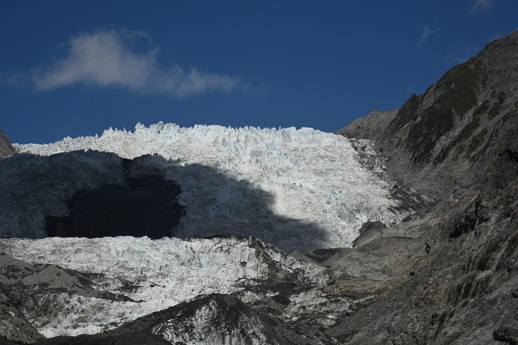 Das Publikum ist übrigens auffallend deutsch. Am Namen des Gletschers zu Ehren der Sissi-Ehemanns und an der Entdeckung bzw. ersten Dokumentation der Eismassen im Jahr 1865 durch unseren in Neuseeland noch immer sehr verehrten Bonner Landsmann Julius von Haast kann es bei der notorischen Geschichtsvergessenheit der Deutschen prä-33 allerdings nicht liegen. Gesprächsthema schien eher die Uni zu Hause, oder die nächste Etappe der Neuseelandfahrt zu sein, oder auch die beste Selfieposition, vorzugsweise einen Meter hinter dem Absperrzaun 🙂 … bemerkenswert jedenfalls, dass der Gletscher und seine imposante Granitkulisse die meisten kaum zu interessieren schien.
