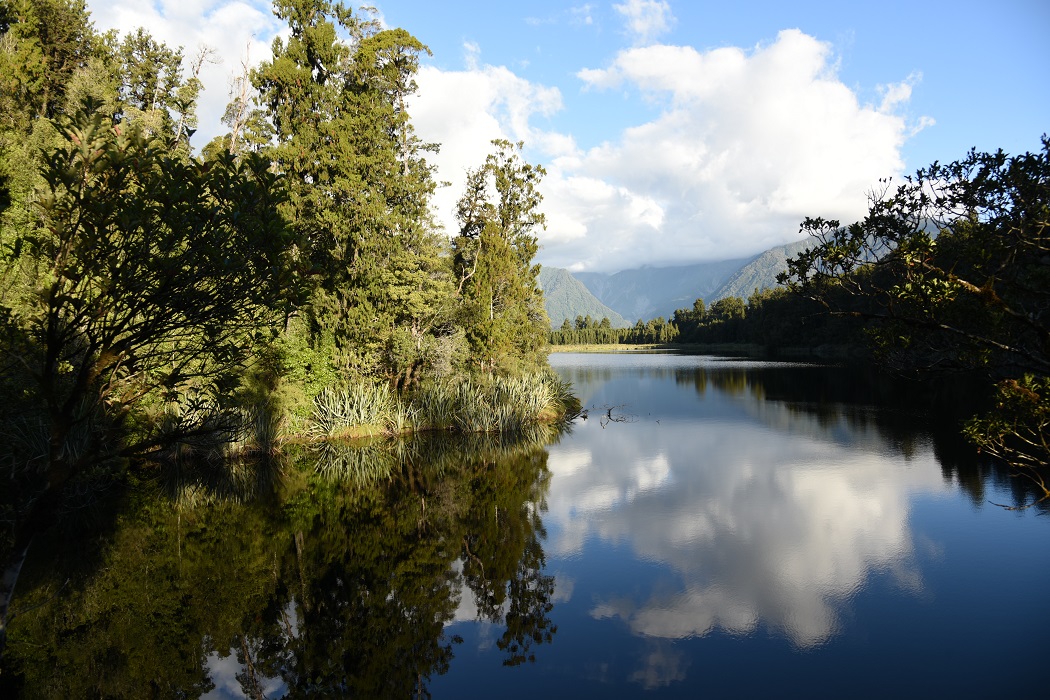 Geheimnisvoll in dichtem Regenwald verborgen ist Lake Matheson so gut abgeschirmt, dass besonders am frühen Morgen und späten Abend, wenn weder Meeresbrise noch Bergwind Wellen aufwirbeln, der See wie ein veritabler Spiegel daliegt in dem sich Aoraki / Mount Cook und Mount Tasman in einer wolkenlosen Minute gleich doppelt zeigen.