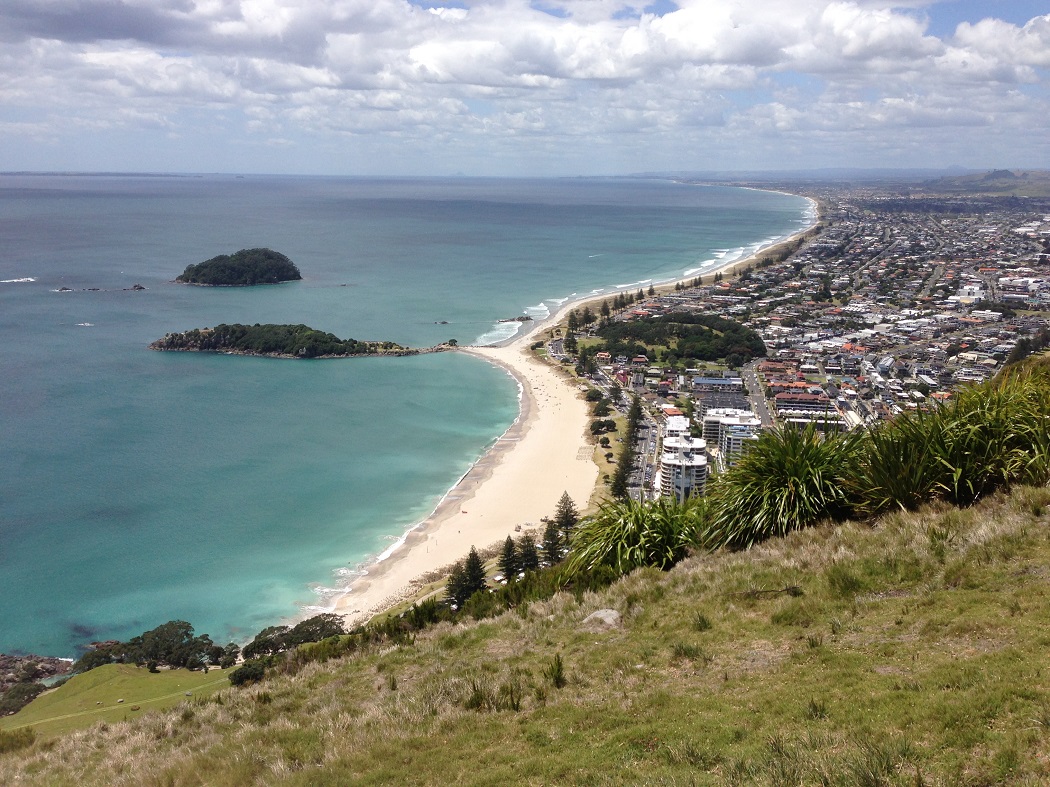 Mount Maunganui vom „Mount“ aus gesehen – wegen der Industrie im benachbarten Tauranga beliebt bei W&T Reisenden (c) Christof Hock / backpackerpack.de