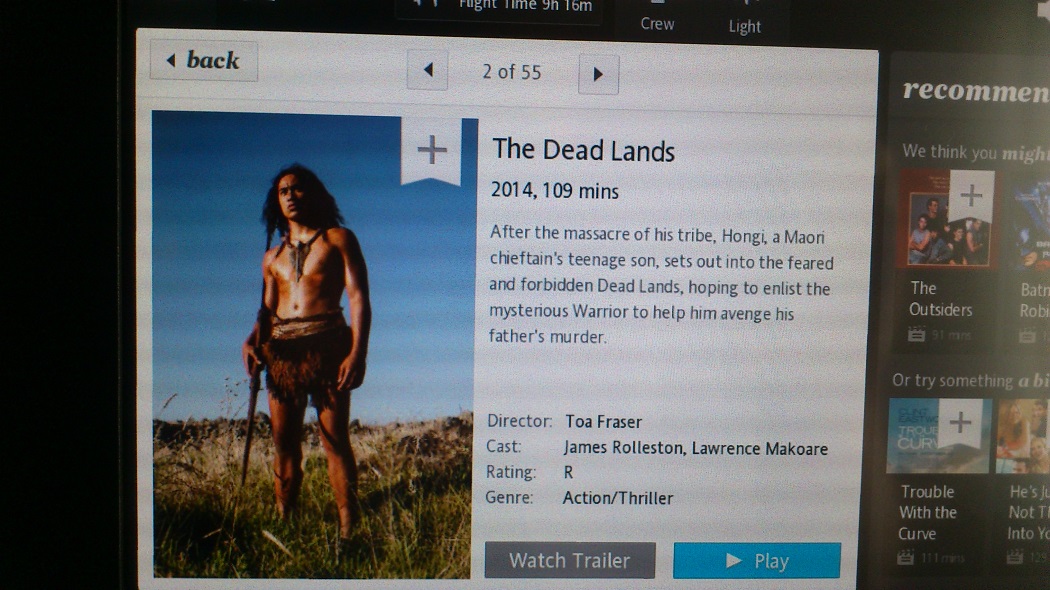 Die Filme selbst, ich nutze kaum die Musik oder Spiele, waren die übliche Hollywoodkost und zusätzlich noch etwas Weltkino und neuseeländische Filme. Der im Foto gezeigte, „The Dead Lands“ war eine eher armselige Nachahmung von Mel Gibsons „Apocalypto“ Epos – eher was für Kenner 😯 . Witzig aber, dass die letzte Szene, der Held blickt entschlossen über die tosenden Wellen eines einsamen Strands offenbar meinen Hausstrand, Bethells Beach, zeigt. Ich frage mich, ob sie die Leute vom Strand einfach weggejagt hatten?