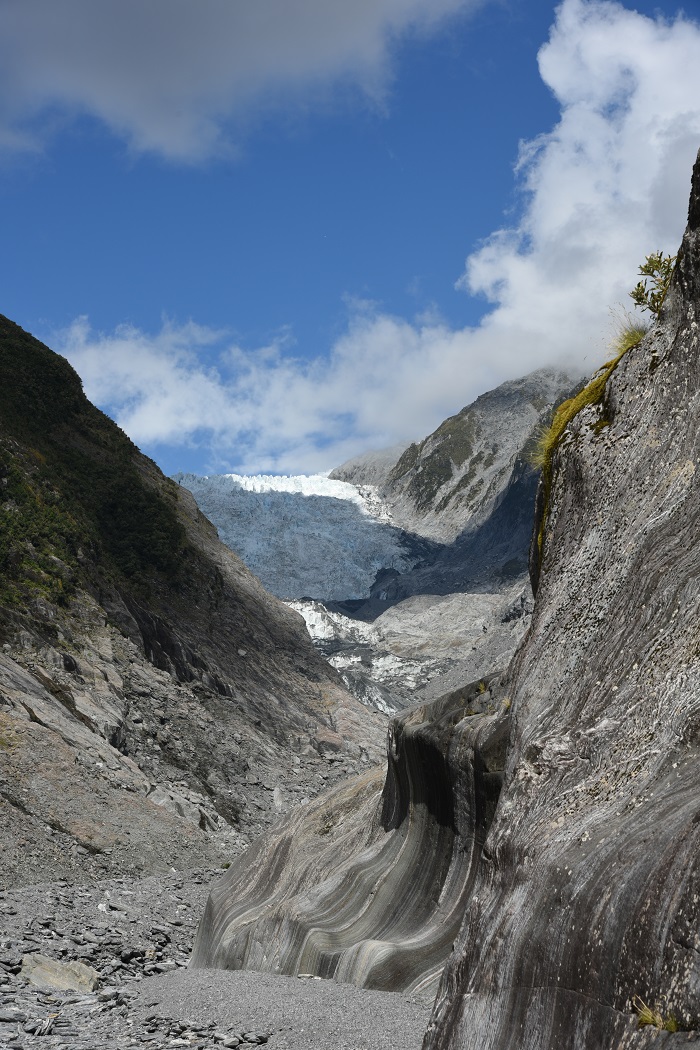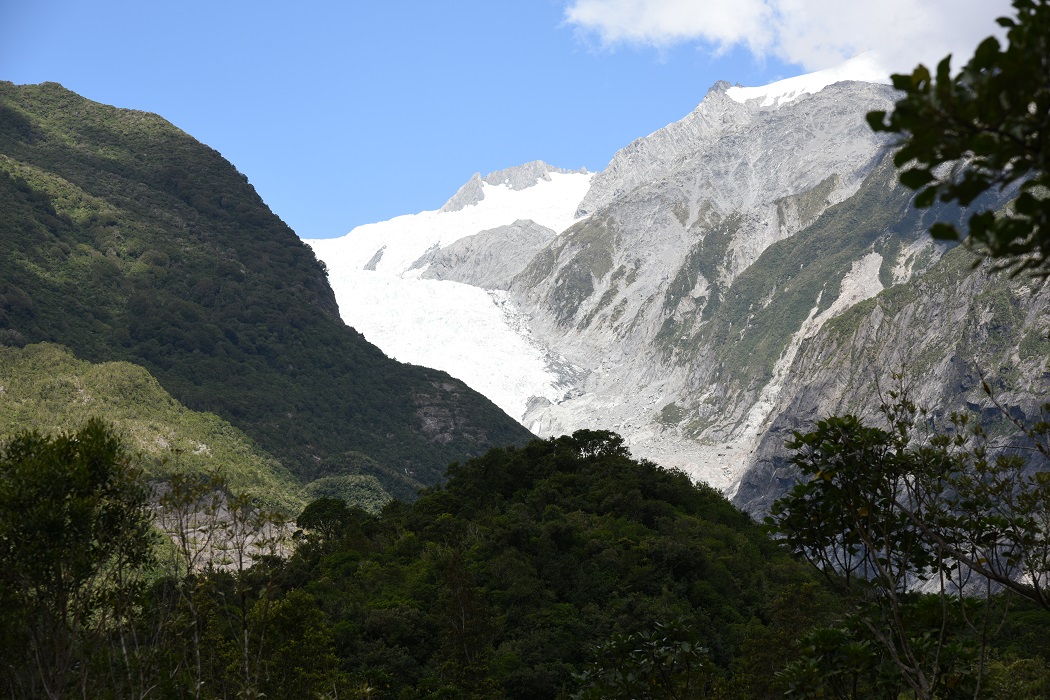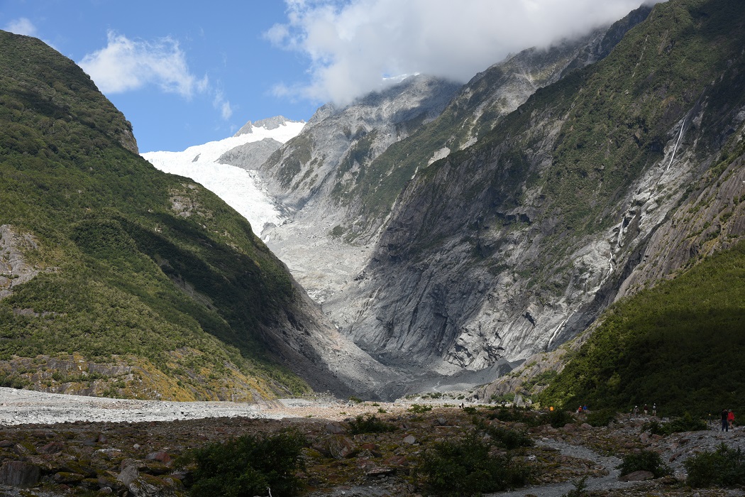 Das Publikum ist übrigens auffallend deutsch. Am Namen des Gletschers zu Ehren der Sissi-Ehemanns und an der Entdeckung bzw. ersten Dokumentation der Eismassen im Jahr 1865 durch unseren in Neuseeland noch immer sehr verehrten Bonner Landsmann Julius von Haast kann es bei der notorischen Geschichtsvergessenheit der Deutschen prä-33 allerdings nicht liegen. Gesprächsthema schien eher die Uni zu Hause, oder die nächste Etappe der Neuseelandfahrt zu sein, oder auch die beste Selfieposition, vorzugsweise einen Meter hinter dem Absperrzaun 🙂 … bemerkenswert jedenfalls, dass der Gletscher und seine imposante Granitkulisse die meisten kaum zu interessieren schien.