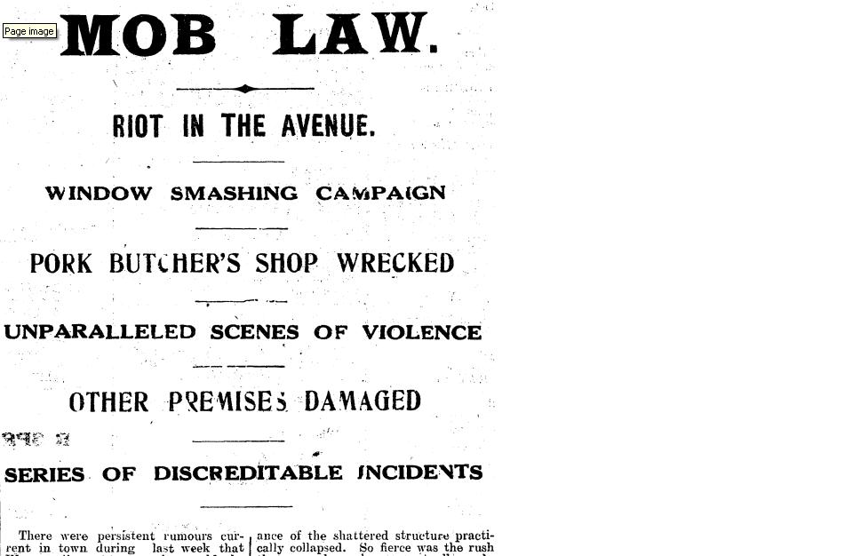 Aber weiter im Text. Neuralgische historische Punkte. Erster und Zweiter Weltkrieg. Als der erste davon ausbrach, hatte Deutschland noch Kolonien im Pazifik, Deutsch-Samoa, und Deutsch-Neuguinea zum Beispiel (dazu gibt es einen sehr informativen Film beim ZDF, Das Weltreich der Deutschen), die aber beide keinerlei militärische Bedeutung im Krieg hatten, da dort praktisch keine deutschen Soldaten stationiert waren. Deutsch-Samoa ergab ich kampflos neuseeländischen Truppen (nichtsdestotrotz hängt im neuseeländischen Parlament eine „Samoa“ Plakette um an den heldenhaften Einsatz neuseeländischer Truppen zu erinnern – *am Kopf kratz*). Die dortige deutsche Kolonialverwaltung wurde in Neuseeland interniert, in einer der beiden Internierungslager Motuihe Island (im Golf von Hauraki, nahe Auckland) für deutsche Truppen und eben Somes Island für deutsche Zivilisten (obwohl ich dazu widersprüchliche Angaben gefunden habe, ich meine im Hinblick auf die Trennung militärisch – zivil: Motuihe wird auch als Lager für Offiziere genannt, Matiu für das gewöhnliche Volk). Irgendwie war so eine Aktion seitens der neuseeländischen Regierung wohl noch nachvollziehbar. Viel umstrittener war die Internierung von ‚enemy aliens‘, die ggf. schon Jahrzehnte davor in Neuseeland eingewandert (oder gar dort geboren waren), aus Deutschland und – interessanterweise – auch umliegenden Ländern, wie Polen und Dänemark, die zu deren Entsetzen irgendwie als quasi-deutsch wahrgenommen wurden. Nicht-eingebürgerte ‚Deutsche‘ traf die Internierung zuerst, aber selbst die Annahme der neuseeländischen Staatsangehörigkeit schien nicht immer vor Internierung bewahrt zu haben. Die britische Propaganda leistete in Neuseeland ganze Arbeit. Es kam zu Ausschreitungen gegen Deutsche und das Eigentum von Deutschen. Eine sogenannte „Women’s Anti-German League“ wurde gegründet. In Wanganui wurde ein deutscher Metzger (schade, dass es den nicht mehr gibt, bei der niederschmetternden Wurst- und Schinkensituation in Neuseeland) für die Kriegsverbrechen Wilhelms II zur Rechenschaft gezogen („Wanganui Chronicle“ vom 17 May 1915):