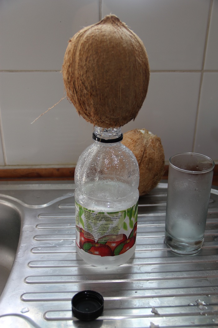 Was auf alle Fälle geht ist kurz vor dem Flug meine Erfindung zur Kokosnusswassergewinnung -siehe Bild – einzusetzen, und eine Flasche von dem köstlichen Göttersaft mitzunehmen. Die Flüssigkeit die man in Deutschland, oder Neuseeland, als Kokoswasser in Dosen zu kaufen bekommt, ist oft aus Thailand und Vietnam, die für ihre Spritzwut mit Chemikalien bekannt sind.
