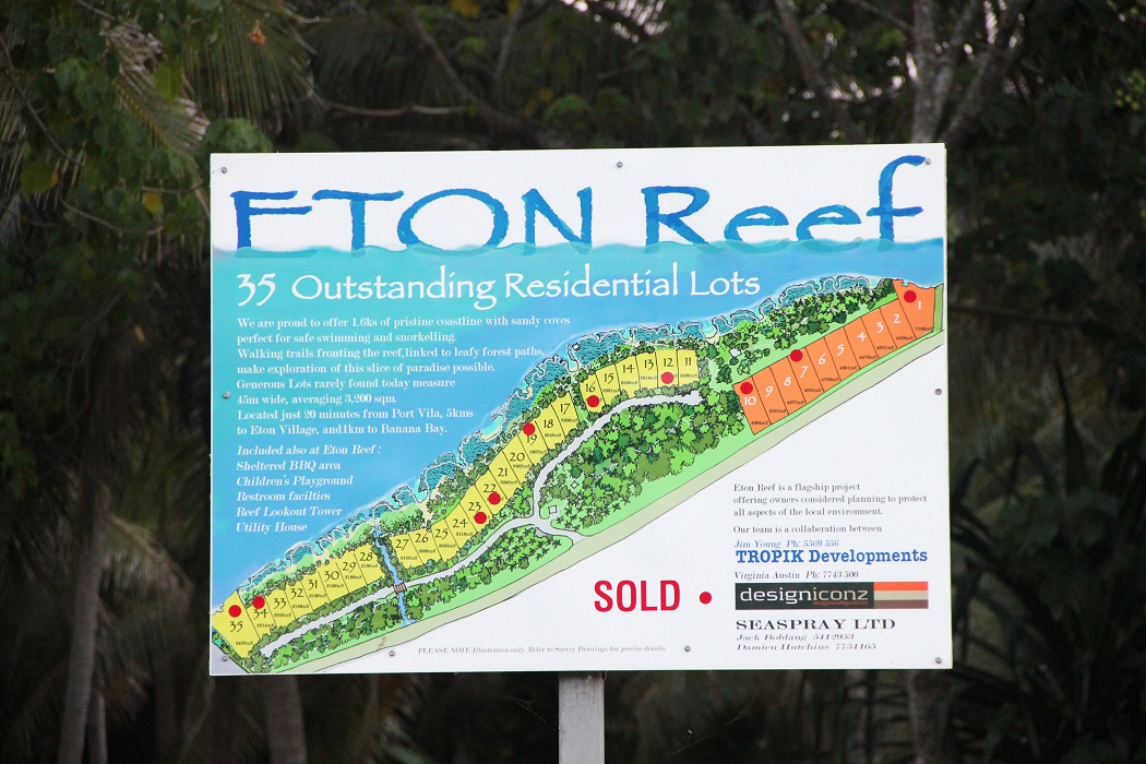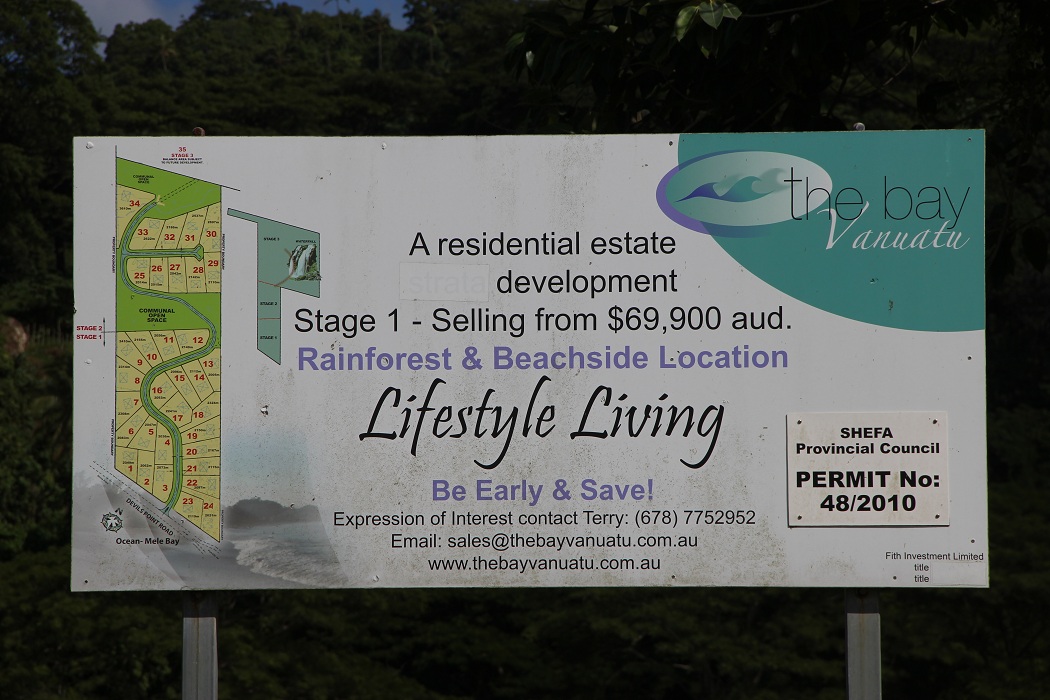 Zweitens … zumindest im Vergleich zu Australien und Neuseeland, allerdings auch immer mehr Deutschland, die flächendeckende Verscherbelung von Parzellen für Immobilien. Selbe Plakate, selbe Sprüche, zum Teil sogar selbe Verkäufer … und in ein paar Jahren der selbe Effekt. Die Ostküste von Australien ist auf tausenden von Kilometern mit Ferienbauten verkorkst. In Vanuatu ist noch Küstenlinie übrig, die die Australier jetzt auch noch zubauen. Die ni-Vanuatu machen bei der Verpachtung für 50 oder 75 Jahre gute Miene zum Spiel, und die Hand auf. Geld korrumpiert, weltweit.