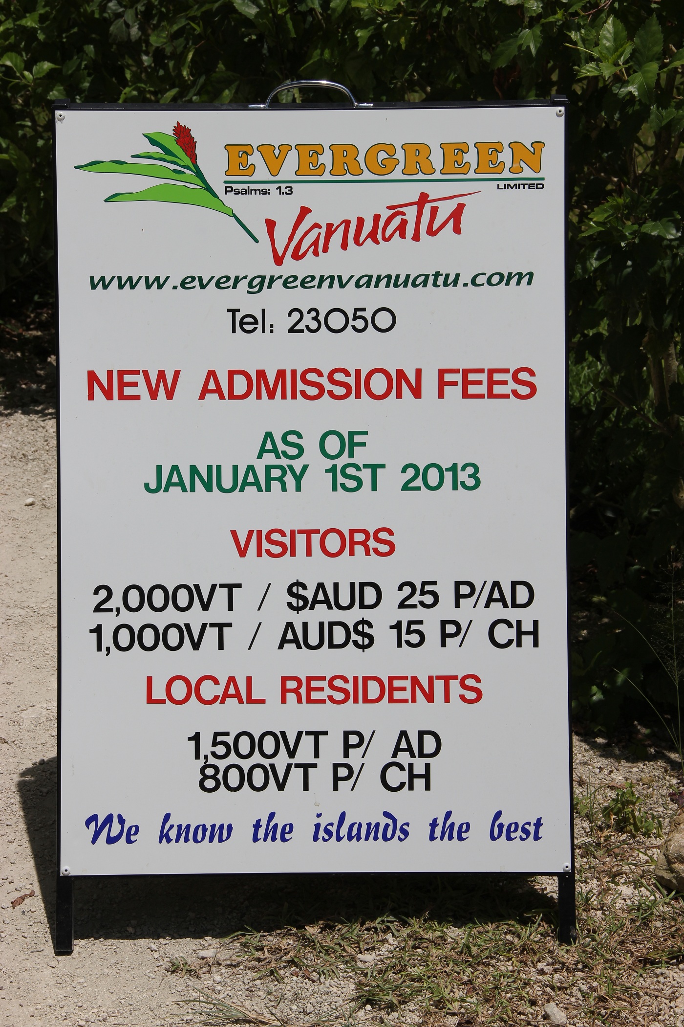 Drittens … Money for nothing, bzw. überall kleine Bescheißereien. Das alte Schizophrenie zwischen langfristigem Gemeinwohl, das auch einem selbst nützt, gegen kurzfristigen individuellen Lustgewinn. „Credit card fees“ von nicht selten 3,5 bis 5%, gegen die jetzt im eigenen Land sogar die verschlafenen Neuseeländer Sturm laufen, sind anscheinend fester Bestandteil vanuatesischen Geschäftssinns. Lächerlich hohe Eintrittsgebühren für schöne Plätzchen in der Natur, weil man darauf spekuliert, dass Touris, die ein kleines Vermögen für die Anreise ausgegeben haben sich letztlich nicht lumpen lassen werden, wenn sie die Sehenswürdigkeiten abhaken bringen schnell, satt und ohne große Mühe Gewinn.
